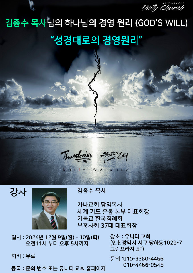 인천의 UNITY교회에서 김종수 목사 초청 성경대로의 경영원리 집회가 12월 9일(월)에 있습니다
