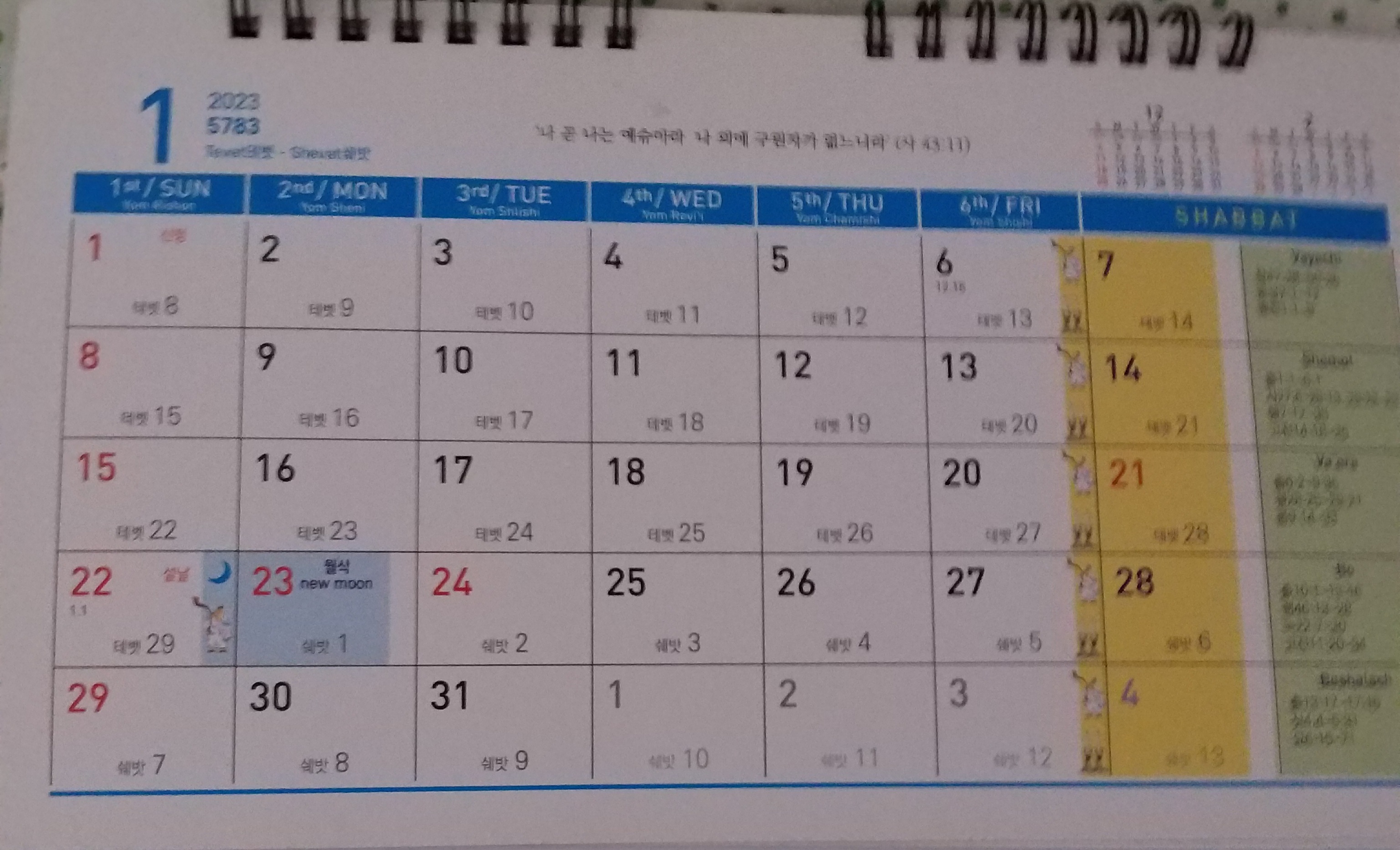 오늘 1월 23일 저녁부터 히브리력의 11번째달인 쉐밧 (Shevat)월이 시작됩니다