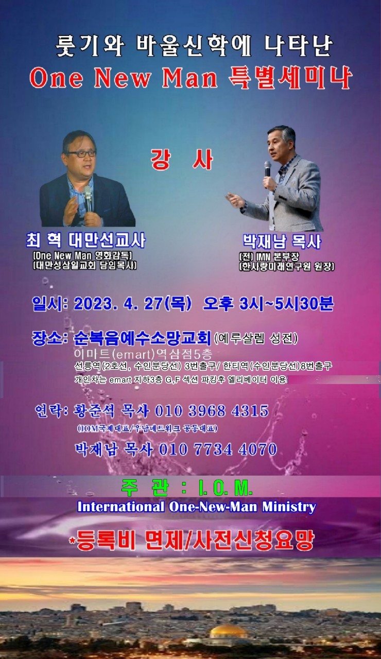 룻기와 바울신학에 나타난 One New Man 특별세미나가 4월 27일 순복음 예수소망교회에서 있습니다